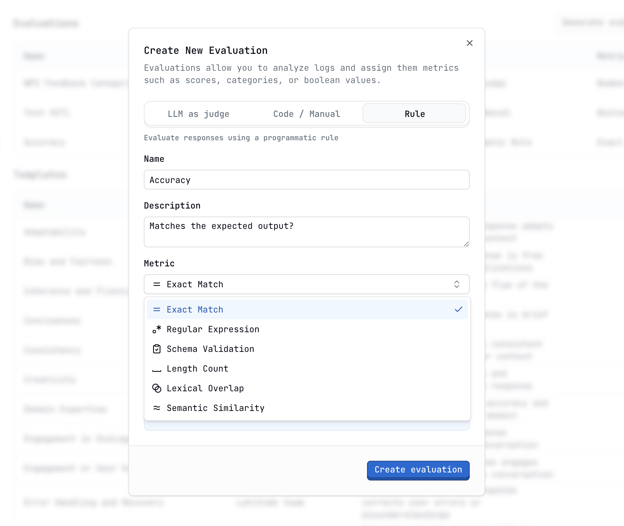 We’ve added a new evaluation type called “Rule-based evaluation”. This new evaluation type allows you to create custom evaluations by defining a set of rules. Each rule can have a threshold and a metric.Within this new evaluation type, we’ve added the following metrics:- Exact Match: Checks if the response is exactly the same as the expected output. The resulting score is “matched” or “unmatched”.