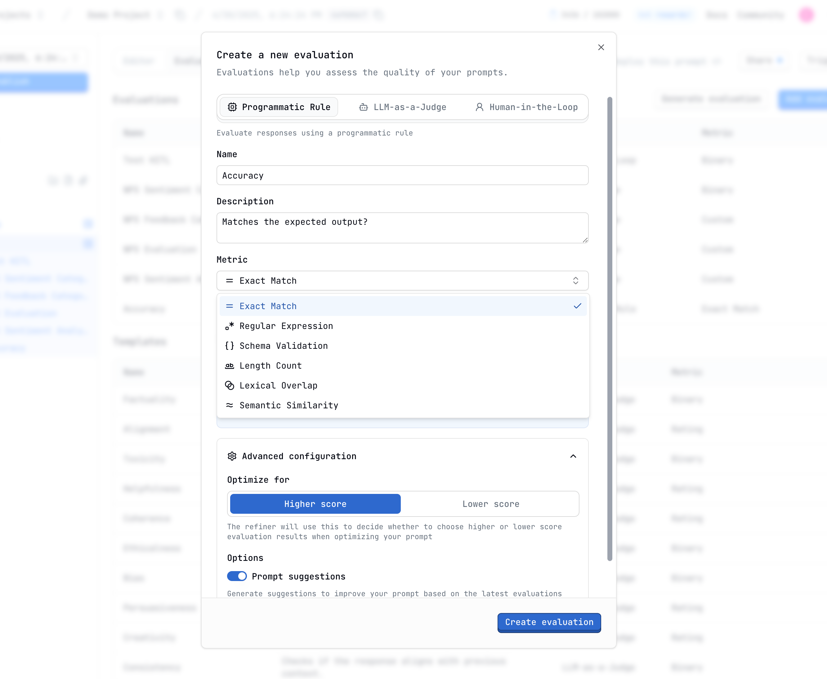 - You can now eject from simple LLM-as-judge evaluations into more complete advanced evaluations that give you complete control over the evaluation prompt